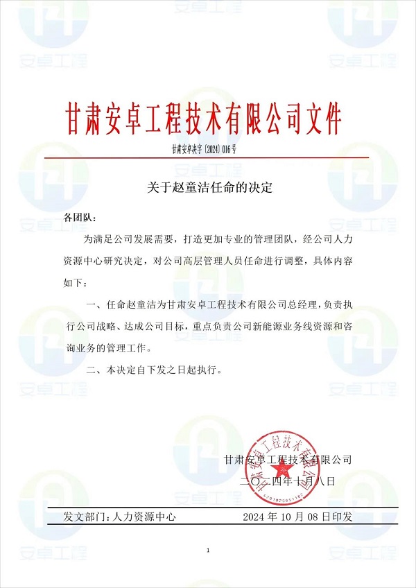 近日,甘肅安卓工程技術有限公司發(fā)布重大人事任命,任命趙童潔為甘肅安卓工程技術有限公司總經理,負責執(zhí)行公司戰(zhàn)略、達成公司目標,重點負責公司新能源業(yè)務線資源和咨詢業(yè)務的管理工作。