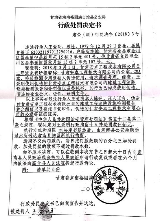 《甘肅省肅南裕固族自治縣公安局行政處罰決定書》肅公(康)刑罰決字【2018】3號(hào)文件,查明王愛(ài)明偽造甘肅安卓工程技術(shù)有限公司的建筑工程消防設(shè)施檢測(cè)報(bào)告、介紹信、委托書、公章等違法事實(shí)。