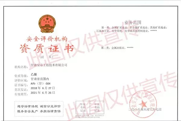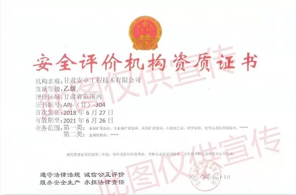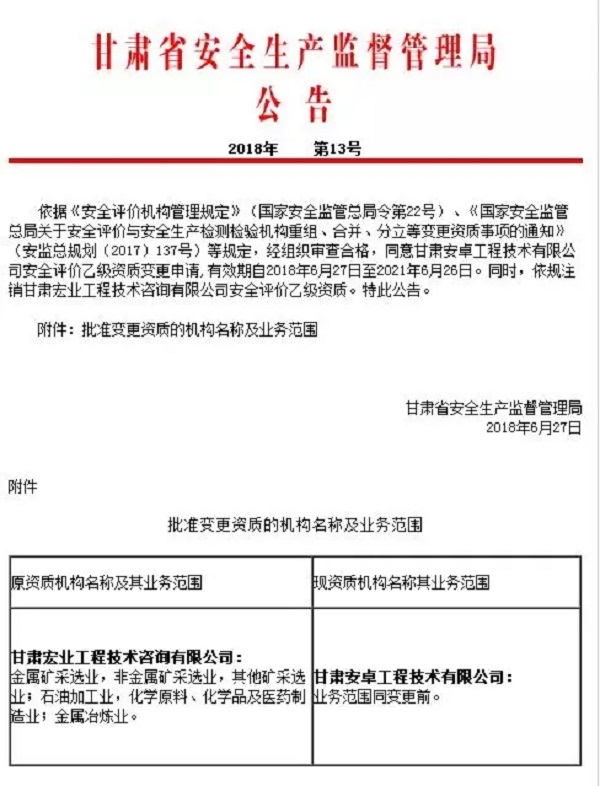 2018年6月27日,甘肅宏業(yè)工程技術(shù)咨詢有限公司安全評(píng)價(jià)機(jī)構(gòu)資質(zhì)已變更為甘肅安卓工程技術(shù)有限公司安全評(píng)價(jià)機(jī)構(gòu)資質(zhì),甘肅安卓工程有限公司成為甘肅省唯一同時(shí)具備安全評(píng)價(jià)資質(zhì)與消防檢測(cè)一級(jí)資質(zhì)的技術(shù)服務(wù)公司!